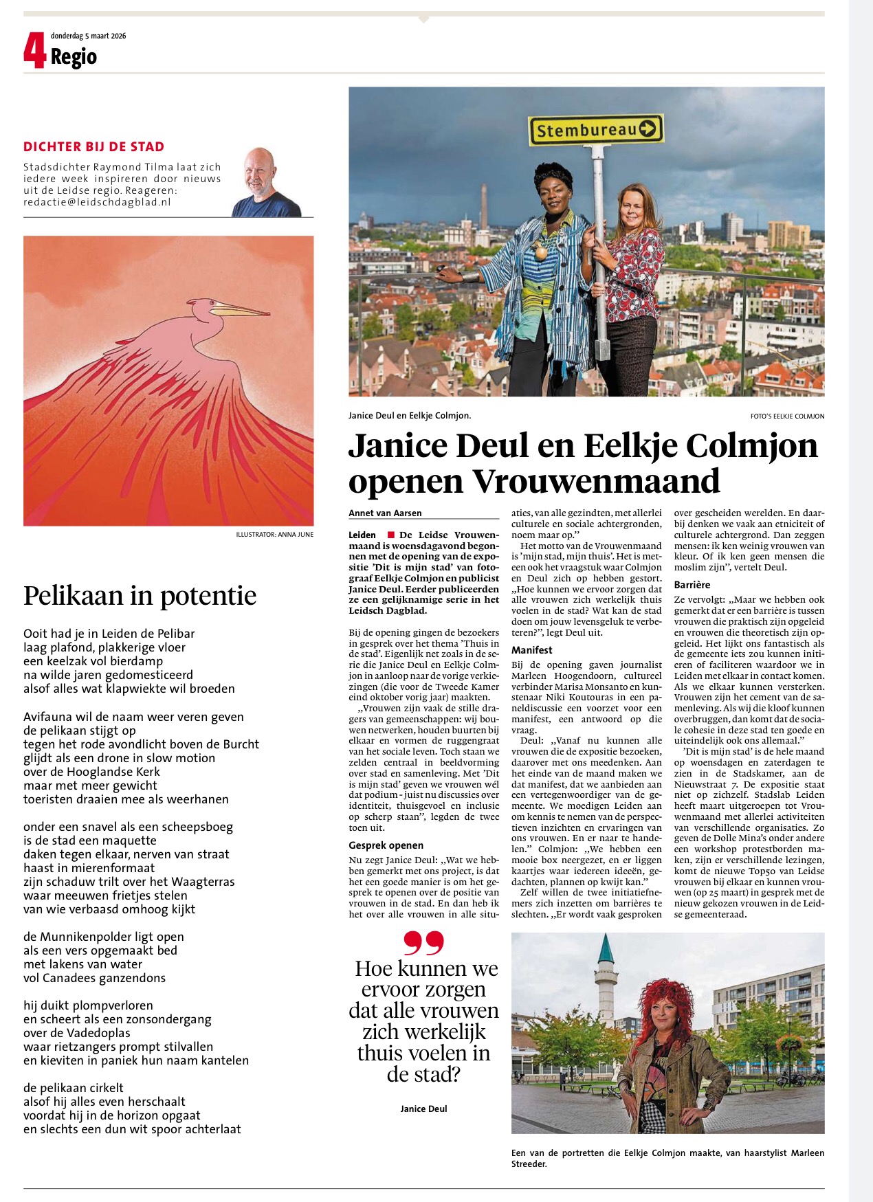 Eelkje Colmjon en Janice Deul exposeren de hele maand maart met hun portrettenserie ‘Dit is mijn stad’, op woensdag en zaterdagmiddagen in de Stadskamer. Zij portretteerden vrouwen die vertellen over hun wijk: wat maakt het tot hun thuis en wat kan beter? De serie verscheen afgelopen zomer in Leidsch Dagblad.